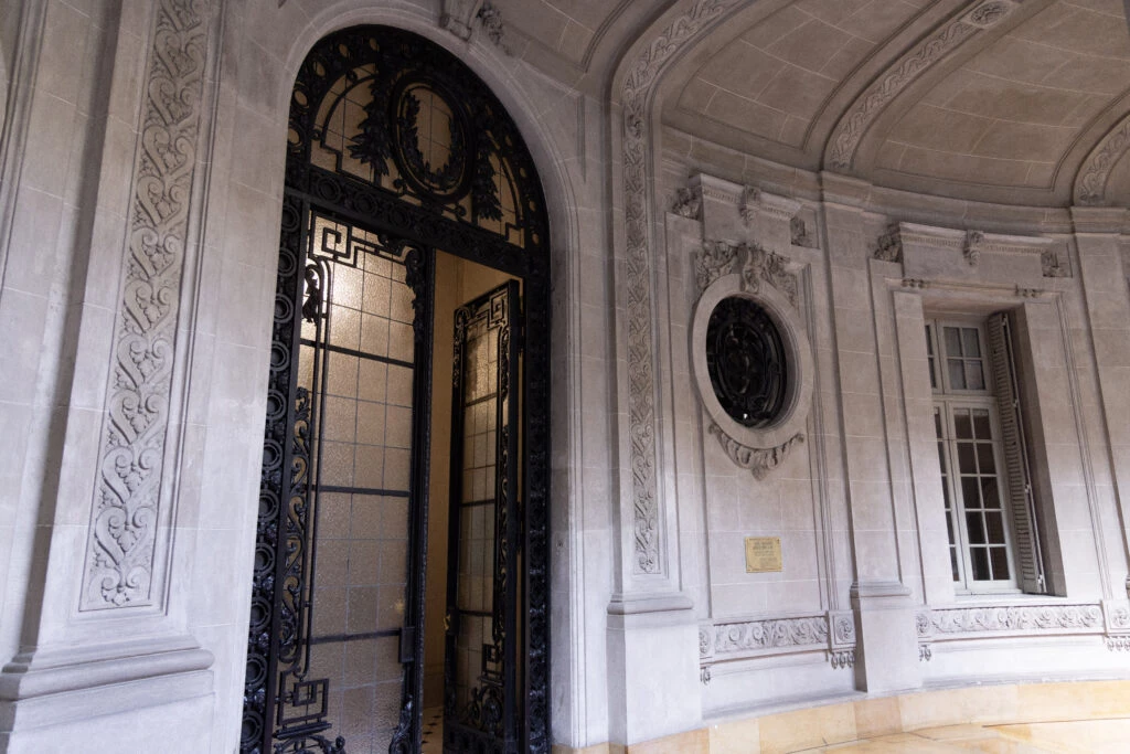 Al ingreso, un gran portal que nos recuerda al Arco del Triunfo sostiene pesadas puertas de hierro, entrada principal al patio de honor de la residencia para galeras y carruajes. En este palacio, la herrería del pórtico, rejas de balcones y marquetería de hierro forjado fueron realizados por herreros artesanos en el taller Zamboni de Buenos Aires. Aquí, el ovalo esta rematado por una balaustrada y sobre ella, se fusionan columnas de fuste libre y capitel dórico que captan la mirada.