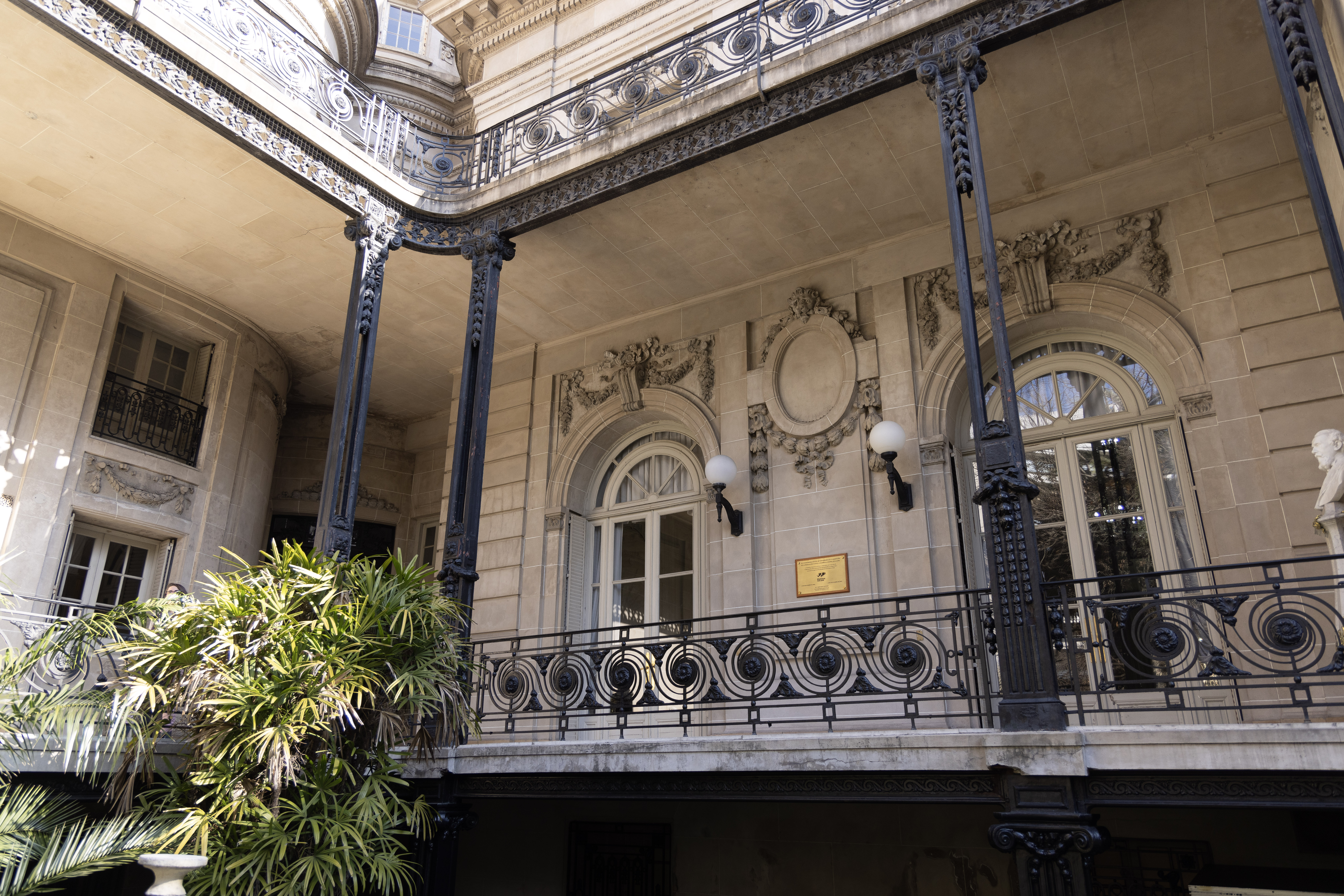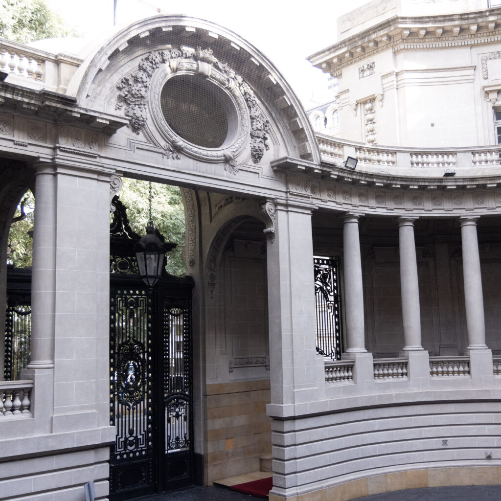 Las líneas de sus bocetos combinan el clasicismo con el art Nouveau para la creación de este “hôtel particulier” parisino. En favor del vocabulario clásico, sus pilastras, molduras y ornamentos, y la mansarda que corona el edificio, con sus techos de pizarra y ojos de buey, son características de la arquitectura francesa de la época, amada por la elite porteña de entonces. Tres residencias, un palacio sobre el terreno limitado por las calles Basavilbaso, Arenales y Esmeralda.
