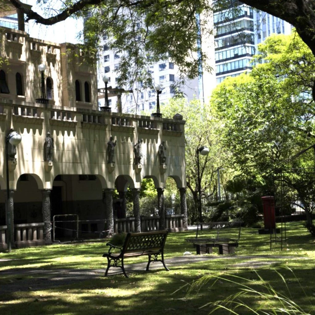 El teatro griego era una estructura al aire libre construido en 1929 que jerarquizaba el paseo de Costanera Sur, embellecido con significativas obras de arte cercanas como la Fuente de las Nereidas y la estatua de Luis Viale.