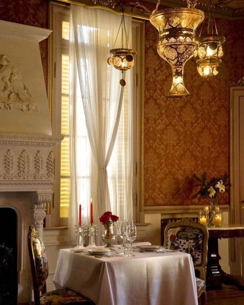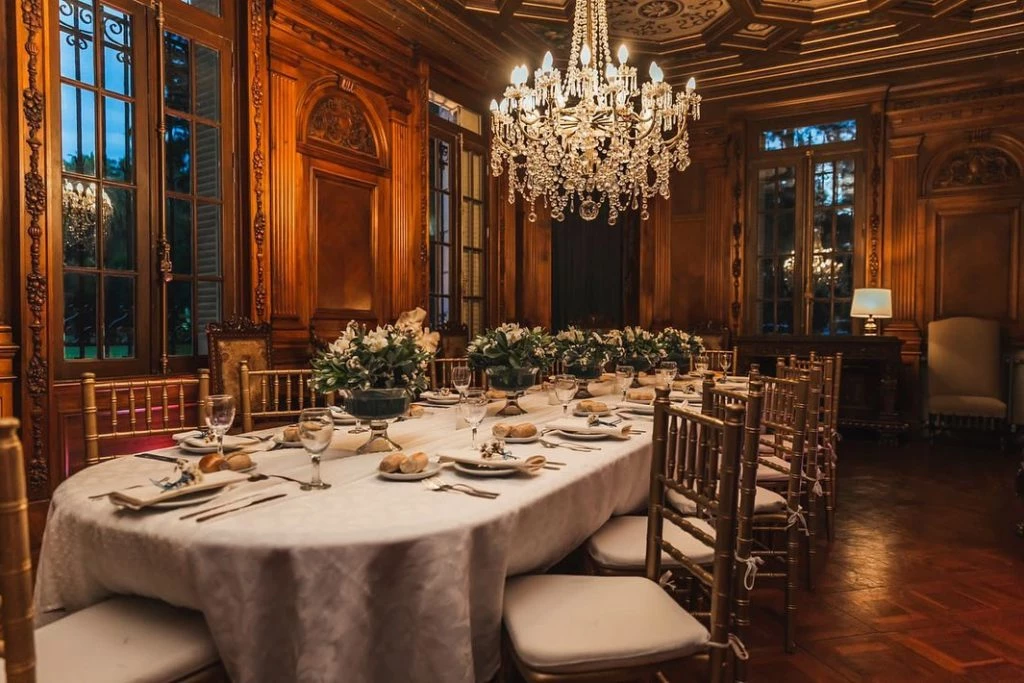 El comedor principal, de estilo renacentista italiano, con pisos de roble de Eslavonia, paredes de cedro y cielo raso pintado a mano aloja obras de arte y mobiliario exquisito. En la esquina asoma el retiro para fumadores.