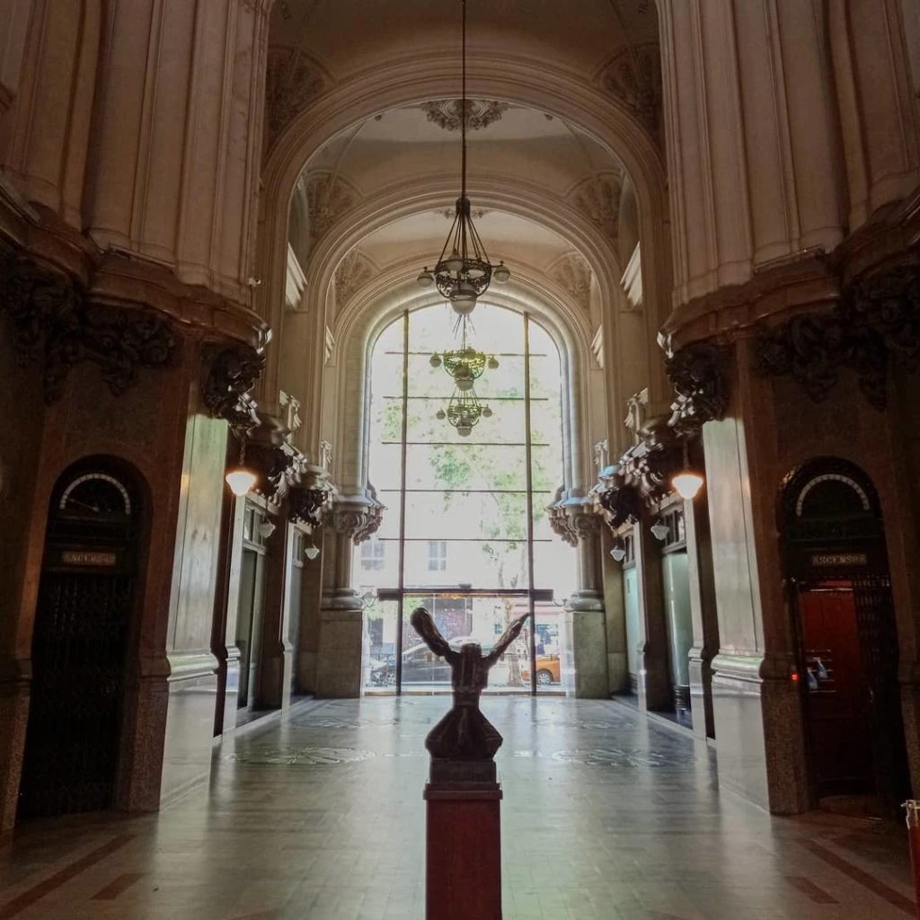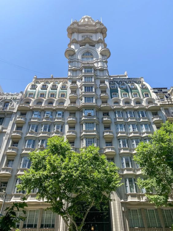 Fue el primer edificio argentino construido con hormigón armado, la escalera tiene 1410 escalones revestidos de mármol de Carrara y decorados con herrajes, vitrales, lámparas y molduras, cuyos muros y columnas fueron revestidos de granito.