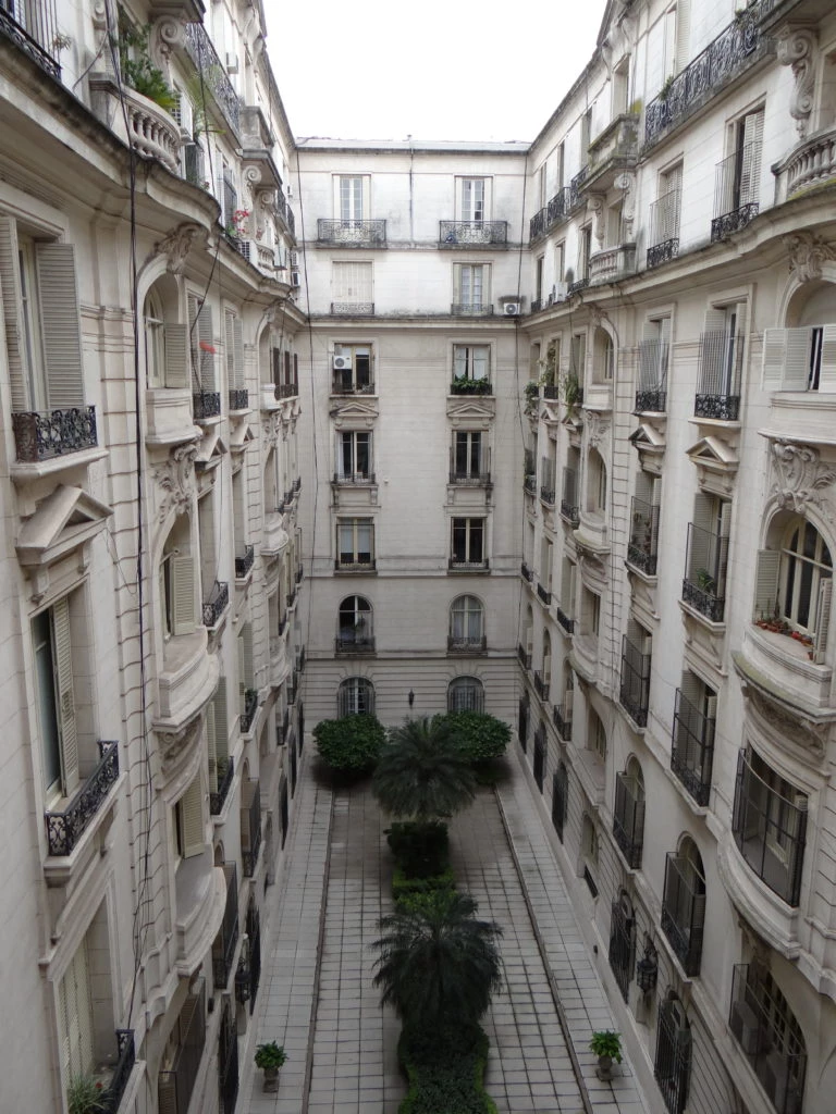 Detrás del reloj, un gomero oficiaba de telón para las fotos de casamiento, dicen lo tumbó una gran tormenta. A ambos lados del patio central, otros cuatro patios interiores unen los cuerpos de departamentos, proporcionando aire y luz a las unidades del contrafrente.
