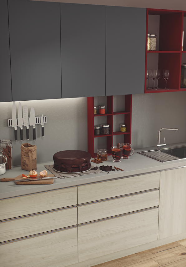 Dentro de las alternativas de unicolores, los tableros de la línea PerfectSense matt de Egger se caracterizan por un efecto suave y aterciopelado, con propiedades anti huellas: son ideales para cuando se eligen herrajes con sistema de apertura “push”.