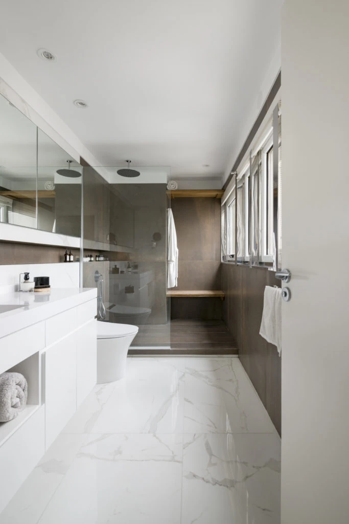 “Enfatizando la linealidad del espacio, propusimos un nicho de apoyo corrido que ingresa al box de ducha íntegramente revestido en el porcellanatto oxido, que contrasta armónicamente con el blanco del piso, mueble y demás elementos”, explicaron acerca del proceso de construcción.