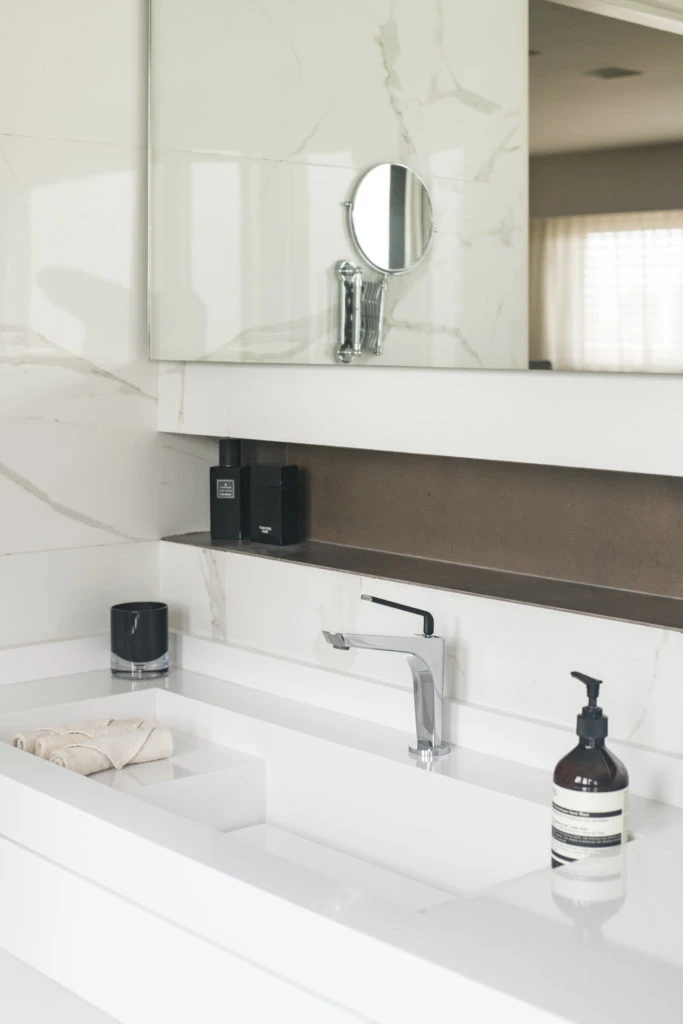 Además, otra de las remodelaciones que se implementó en el espacio fue una expansión de la mesada, diseñada en el material blanco suez. Para lograrlo, desde el estudio de arquitectura optaron por quitar el bidet y colocar un inodoro inteligente.