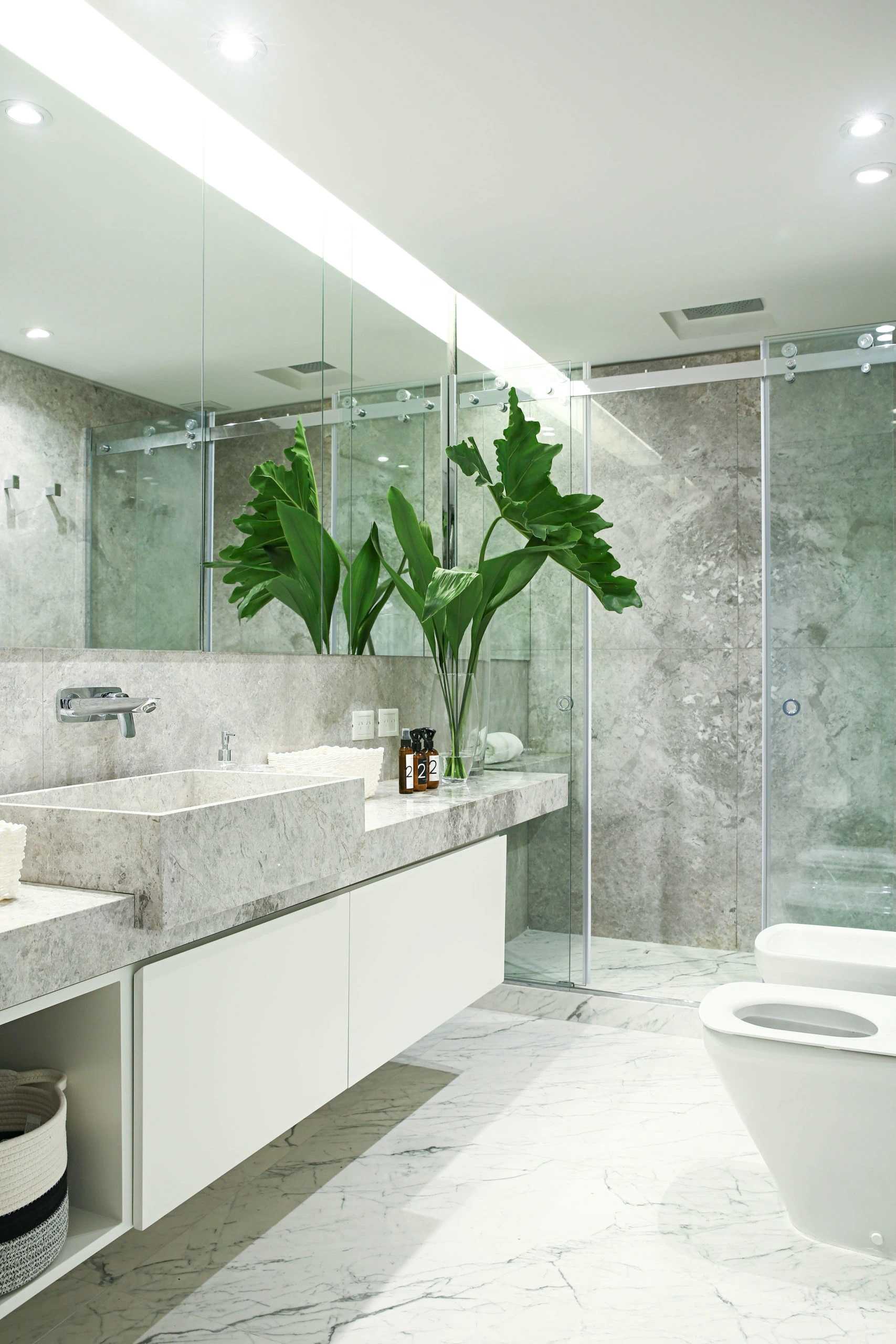 En la obra de remodelación del baño llevada adelante por @estudiomodocasa, se planificó utilizar materiales de fuerte durabilidad y sensibilidad estética. Finalmente, se decidieron por Laminan Statuarietto, una superficie blanca con vetas en tonos grisáceos. Además, sumaron un poco de color verde para otorgarle vida al espacio.