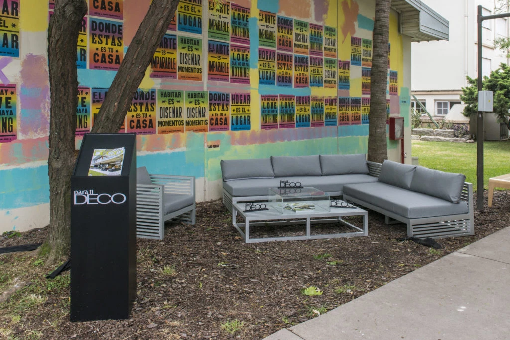 La revista Para Ti Deco estuvo presente en Casa Foa con un living al aire libre equipado con los muebles de Pampa Living. Como fondo, el toque de color del mural creado con los coloridos afiches con frases del Tano Verón.