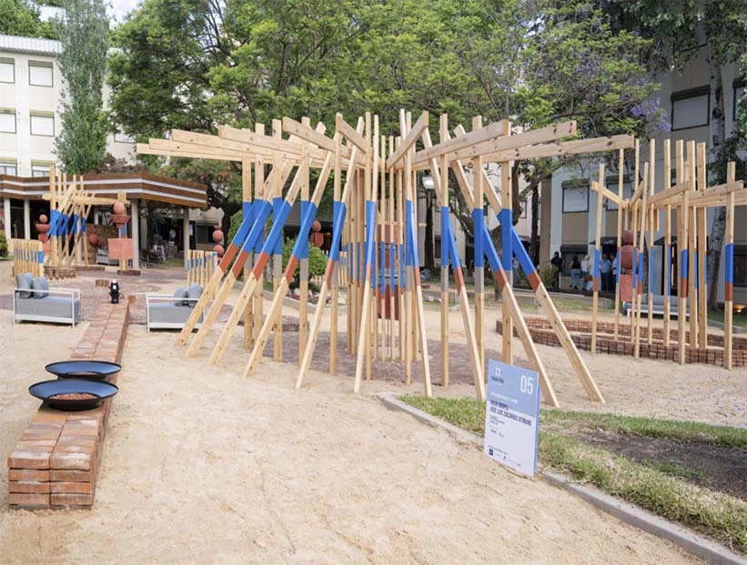 “Cómo los humanos se relacionan con los objetos y el espacio que los rodea” fue la pregunta que determinó el desarrollo de unas geometrías circulares resueltas con ladrillos macizos reutilizables, al igual que la arena (ambos serán donados), pérgolas de madera intervenidas por Rosa Benedit y tratadas con Belleza Natural de Cetol y unas esculturas terracotas diseñadas por Oropel que sumaban la tan necesaria presencia del arte. Los muebles para exteriores (Pampa Living) completaban la propuesta.