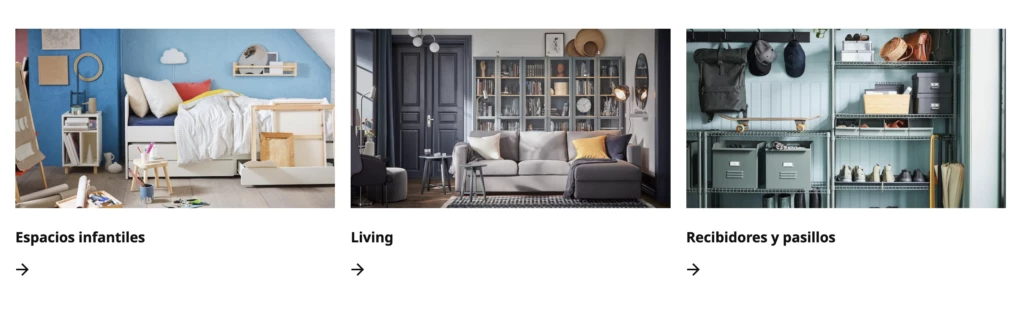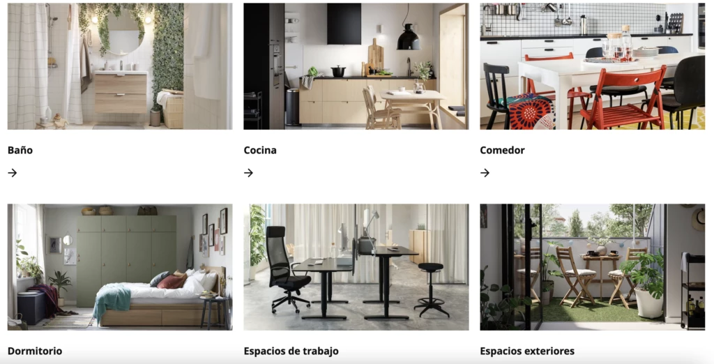 Navegando por la página oficial nos encontramos con 9 secciones divididas según el espacio. En cada una de ellas podés encontrar los muebles, objetos y accesorios para ese sector en particular.
