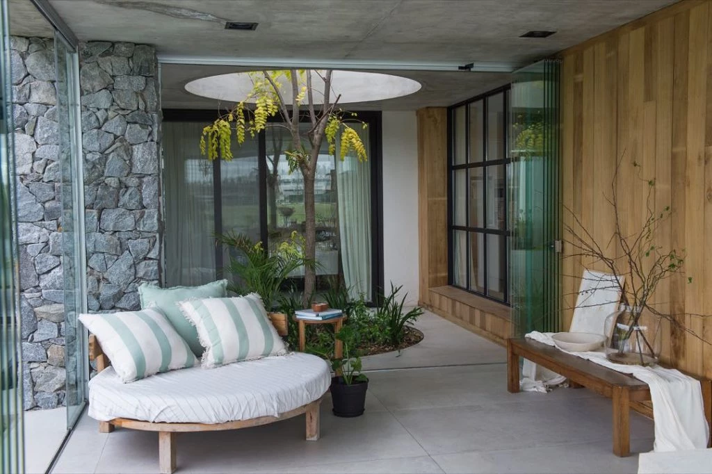 La galería forma una gran “L” con una suerte de patio interno en el punto central, también cerrado con vidrios plegables. Allí, un hueco calado en el techo de hormigón le deja via libre a la Acacia Frisia, un árbol de crecimiento rápido cuyas hojas, cuando pega el sol, regalan destellos dorados. A su lado, un comodísimo sillón redondo (@lebonhouse). Almohadones (@guazunambi.muebles).