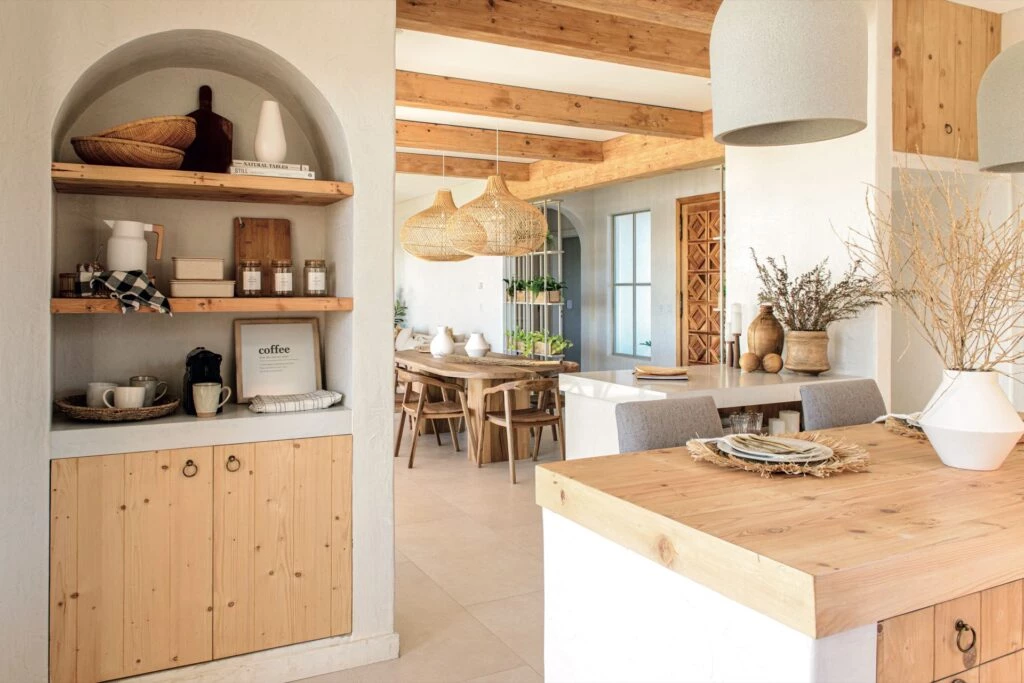 En el interior sorprenden las paredes estucadas (emblema de la casa de playa) y los muebles de madera: mesa de comedor maciza de petiribí y sillas de la misma madera. Las lámparas colgantes son modelo Morixe (todo @solpaloudeco).