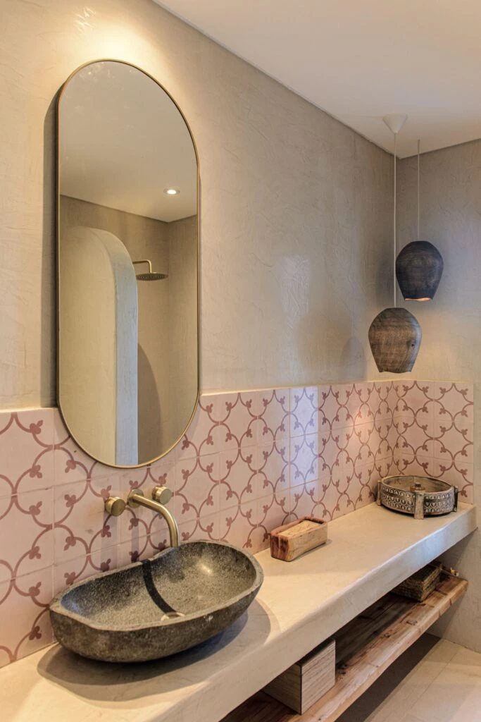 Para el toilette, mesada en estuco veneciano, bacha de piedra, grifería Fabric Gold (Peirano) y alzada con calcáreos en tonos rosados @gattimosaicos). Las lámparas colgantes son dos jarrones agujereados.