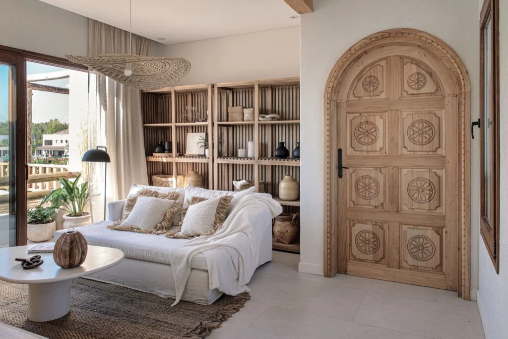 Resaltan los tonos de la madera y las fibras naturales: un espejo de 2 x 1 m en madera de ciprés, mesas de centro de madera guaica, silla de caña junto a un trio de lámparas colgantes (modelos Testsu y Cardamomo), un ventilador de fibras naturales y una alfombra de yute (todo de @solpaloudeco).