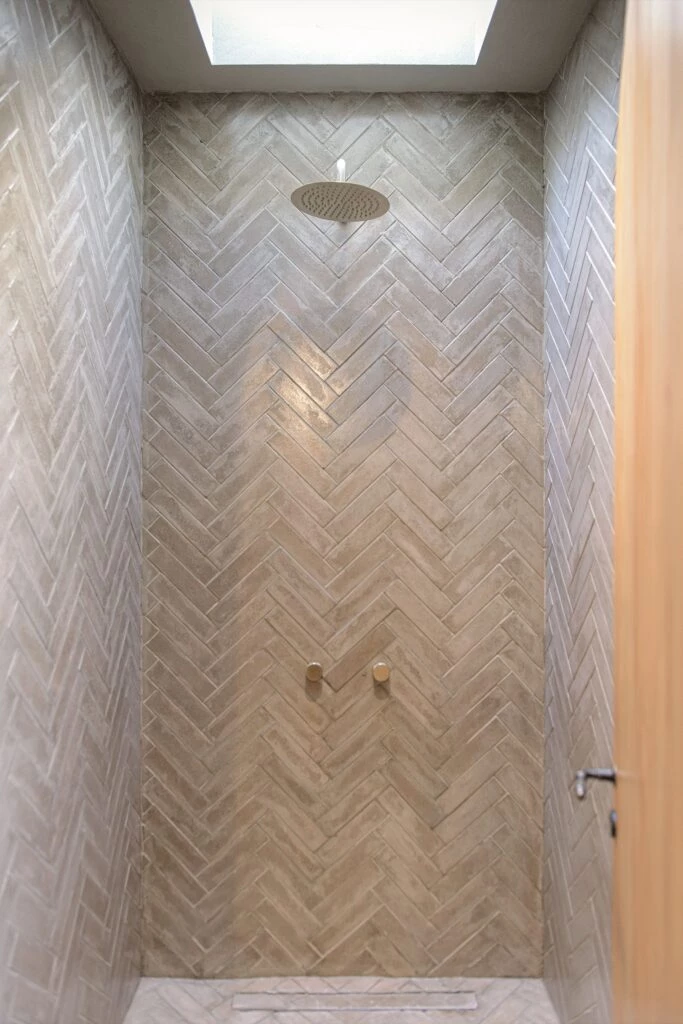 El baño principal tiene una mesada de cemento estucado H161 (mismo material de las paredes), con estante bajo en madera de pino Oregon, bachas en verde oliva (@concavoestudio), y grifería de pared Fabric Gold (Peirano). El cielorraso sorprende con un revestimiento de cañas, y las ventanas tienen marcos de PVC foliado modelo Golden Oak, con parasoles de madera de grapia. Para la ducha, azulejos (@gattimosaicos) y grifería (Fabric Gold, de Peirano).