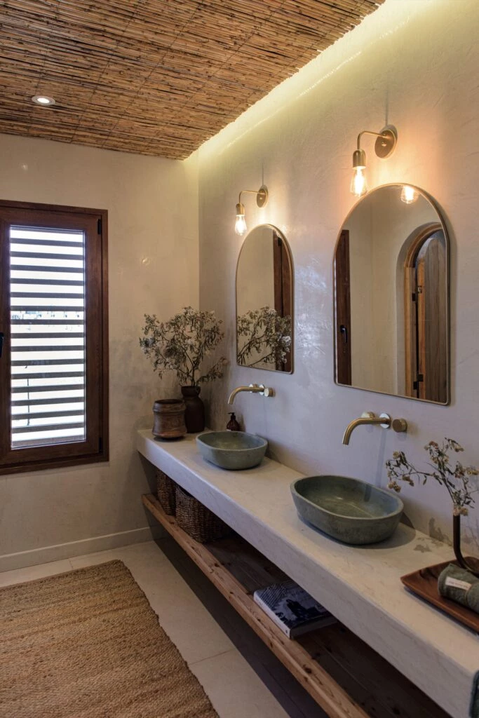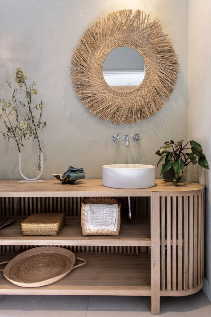 El baño en suite tiene un mueble “Bau” varillado en madera álamo teñido con laca transparente, grifería de pared modelo Valencia (Peirano) y bacha de apoyo (Zetta Concrete). Bandejas de fibras naturales y espejo (@solpaloudeco).