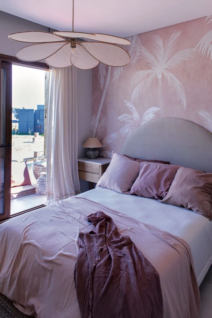 Un dormitorio teen y femenino, en tonos rosados y con un mural de Mercedes Costal como protagonista. La ropa de cama en linos teñidos a mano en distintos tonos rosas suma almohadones haciendo juego. Lámpara con pétalos modelo Aruba, de 1 metro de diámetro (@solpaloudeco).