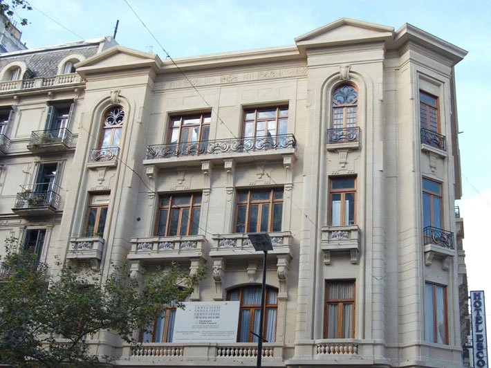 El Hotel Tango de Mayo funciona en un recuperado edificio histórico de notoria singularidad del Art Nouveau, construido en 1913 por el arquitecto italiano Fausto di Bacco. Se trata del Edificio Singer, que posee dos edificios gemelos en Montevideo y París.