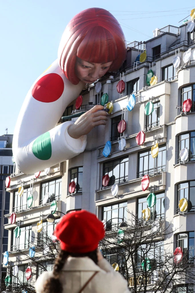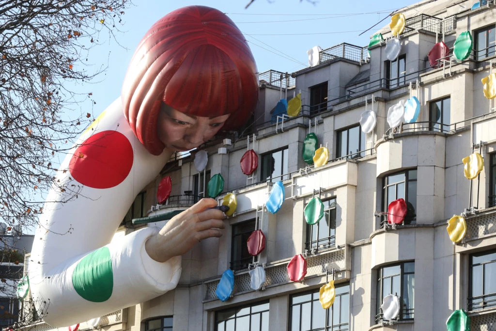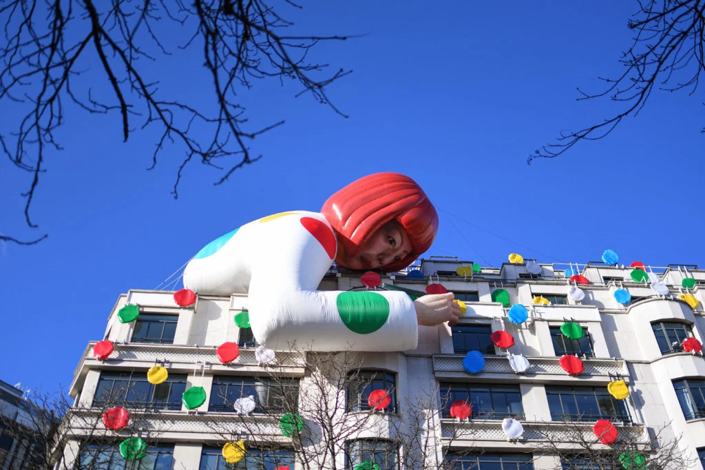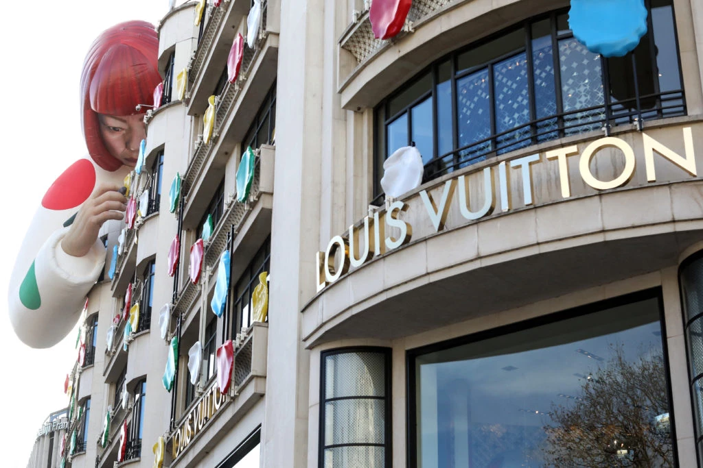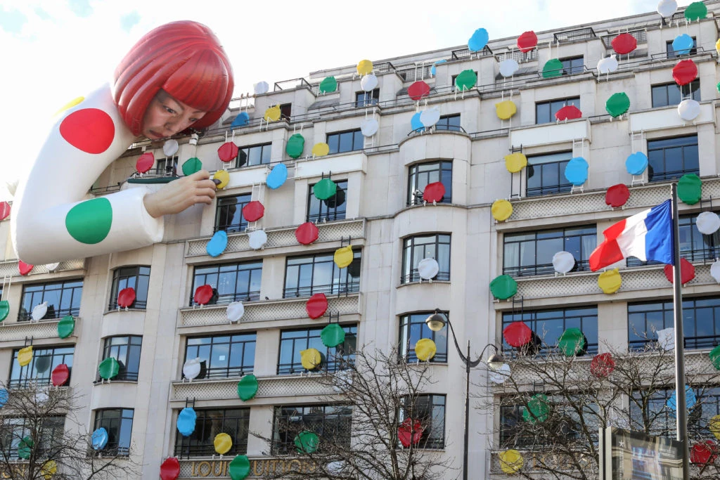 La tienda de Louis Vuitton en Paris, que se encuentra en Champs Elysées y es reconocida mundialmente por su fachada art déco -construida y planeada por Georges Vuitton en 1912-, está repleta de los icónicos lunares de colores de Kusama y justo en la esquina se ubica una gigantesca escultura robótica de la artista abrazada al edificio, como si se aferrara al arte.