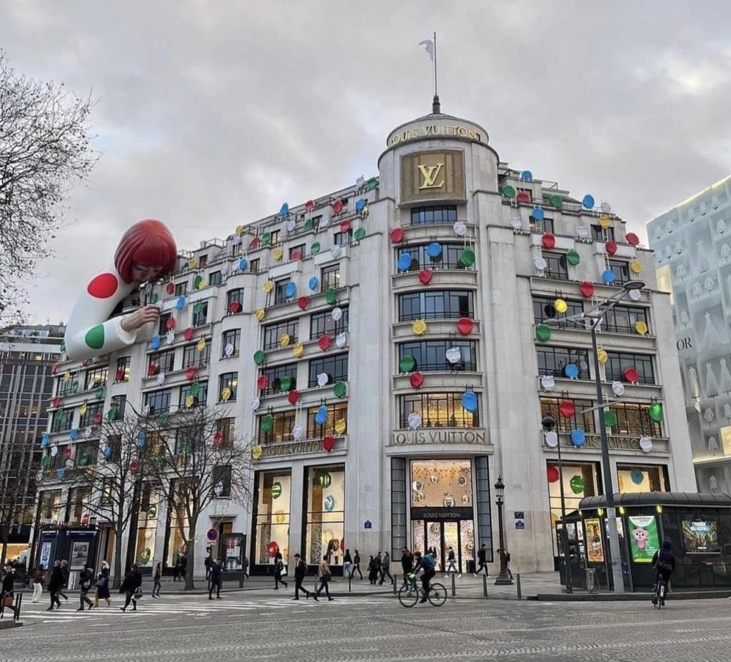 Con esta nueva intervención que sorprenda a locales y turistas, la emblemática artista contemporánea japonesa ya es la musa total de tres instalaciones de la marca de moda de lujo.