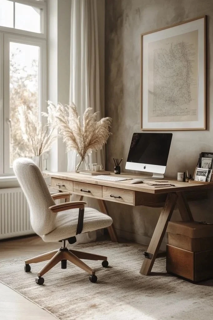 1. Claridad minimalista. Un escritorio wabi-sabi parte de líneas simples y superficies despejadas. Escritorio amplio, pocos objetos a la vista y almacenamiento oculto.