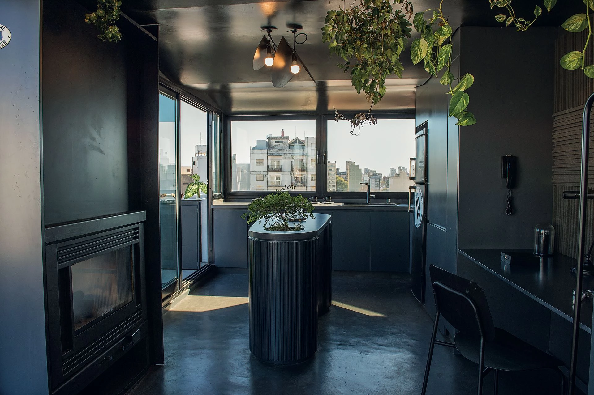 Otras plantas colgantes se suman desde el cielorraso, donde dos lámparas realizadas artesanalmente (@romartinez.arte) se ocupan de bañar a la isla de luz y volverla aún más escenográfica.