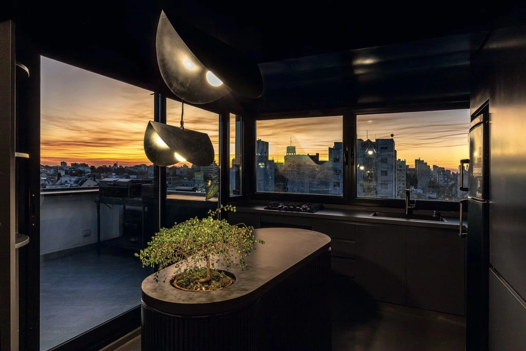 La cocina era originalmente un lavadero con un pequeño patio. El estudio optó por cerrarlo y aumentar su funcionalidad: dispusieron la mesada contra el ventanal, sumaron un mueble fijo para la heladera y el lavarropas oculto y acomodaron al centro una pequeña isla de diseño curvo, con su base varillada y laqueada en gris, que contiene un bonsái de más de 30 años en un extremo.