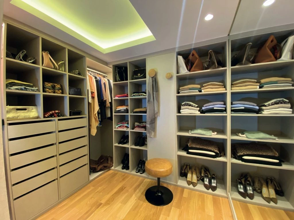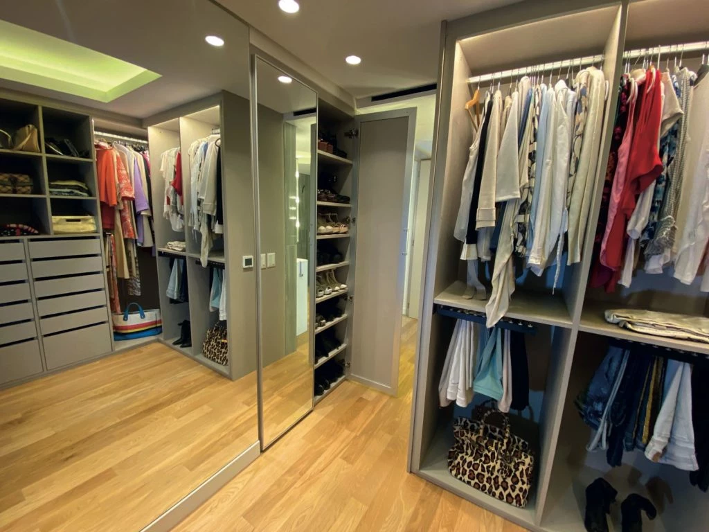 El vestidor propone una linea de placards con puertas espejadas y otros módulos abiertos diseñados en melamina textil gris (@occhipinti_ok), además de unos botones de roble americano (@broccamuebles) a modo de percheros.
