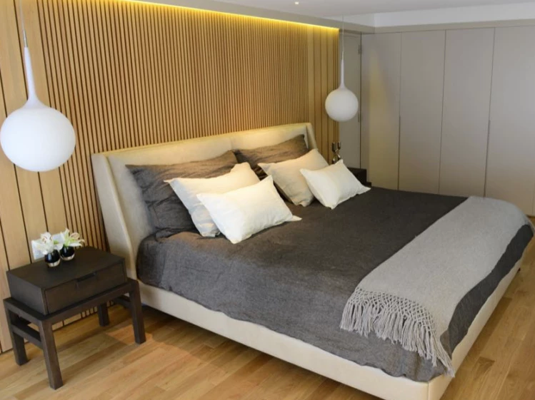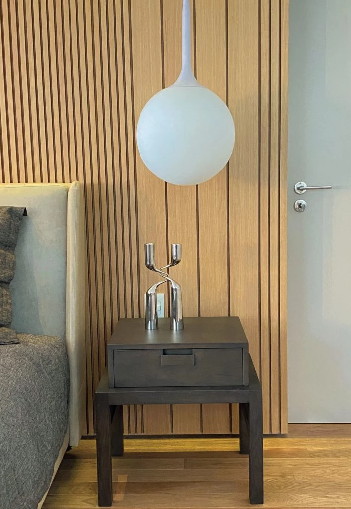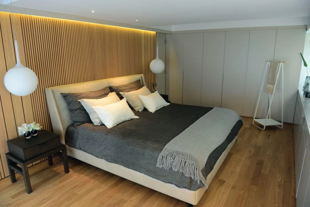 La reforma incluyó el diseño de un revestimiento de roble americano con lustre poliuretano definido con distintos módulos verticales y buñas (Carpintería Palo Rosa) que, además de dividir el espacio, le da apoyo a la cama modelo Spencer tapizada en cuero y textil gamuza (Ramirezei) y a las mesas de luz Thronos de madera lenga lustre gris lavado, diseño de las arquitectas (Carpintería Palo Rosa).