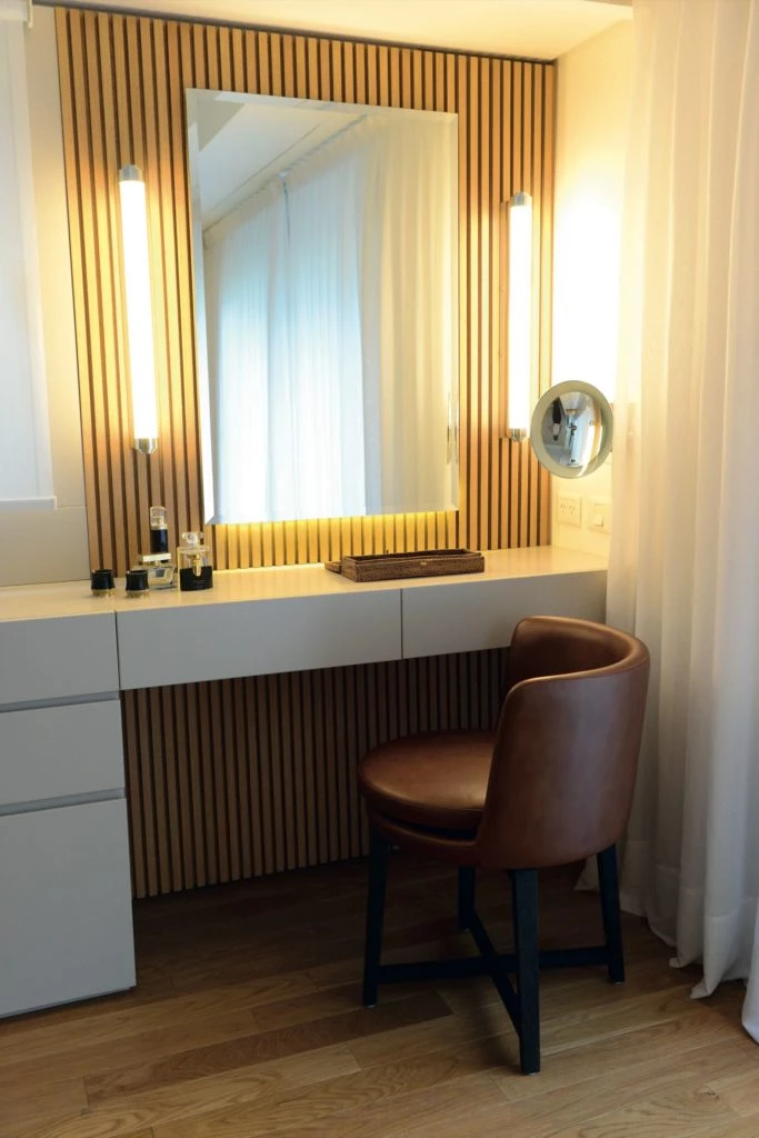 Frente a la cama se desarrolla un mueble lineal con terminación en laca ceniza que en una esquina le deja lugar al maquillador, combinado con un revestimiento de roble americano que sostiene el espejo con led lateral y aparece flanqueado por unas con lámparas cilíndricas. Lo acompaña una silla tapizada en cuero con base madera (Ramirezei).
