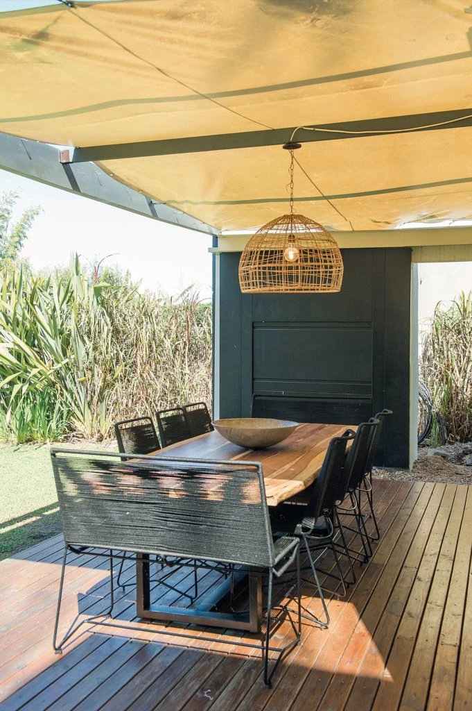 Bajo la pérgola con tela náutica y postes pintados de negro, se acomoda la gran mesa rústica de madera de incienso de 2 pulgadas, con patas de hierro negro, sillas en hierro y cordón, aptas para exteriores y una lámpara kraft, todo del Con pasión deco (@conpasiondeco), el local de la decoradora y dueña de casa. La parrilla pintada de negro se cierra con tapa de hierro.