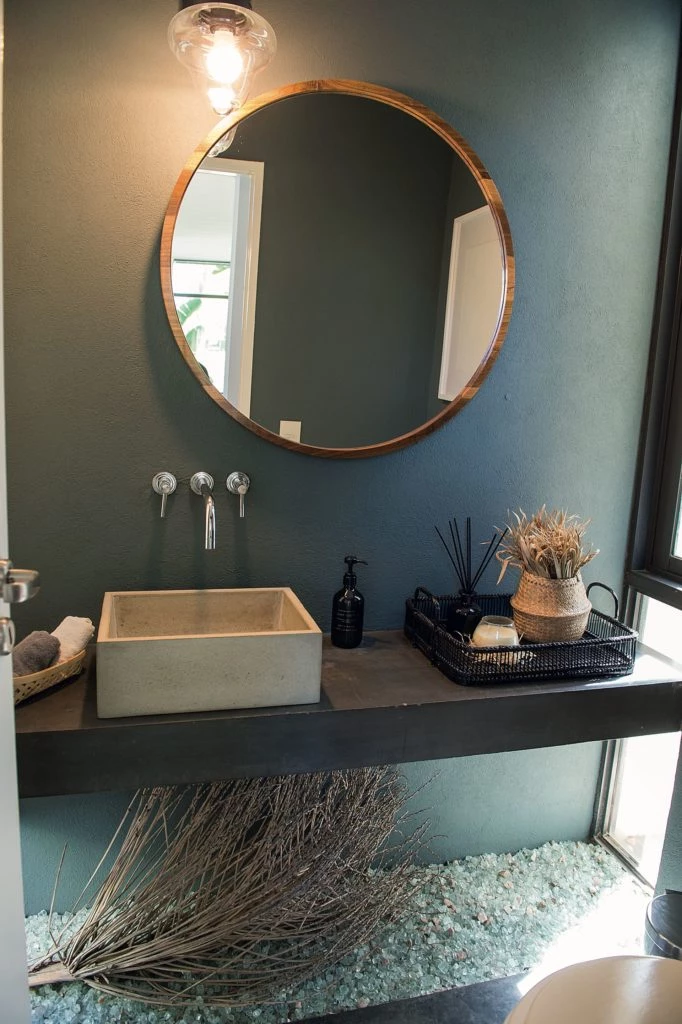 El toillete, con pared color gris y espejo con marco de petiribí de 0,80 de diámetro, mesada de microcemento gris grafito y bacha (@zettaconcrete). Aplique Oslo (@hadodeluzlamparas).