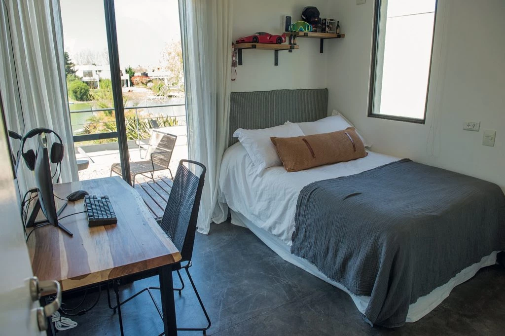 En otro dormitorio, cama con respaldo entelado en tussor gris a rayas, manta de pie de cama doble en gris grafito waffle y almohadón color canela con detalles de cuero. El escritorio de corteza de incienso y patas de hierro se luce junto a una silla en cordón y hierro (ambos de @conpasiondeco).