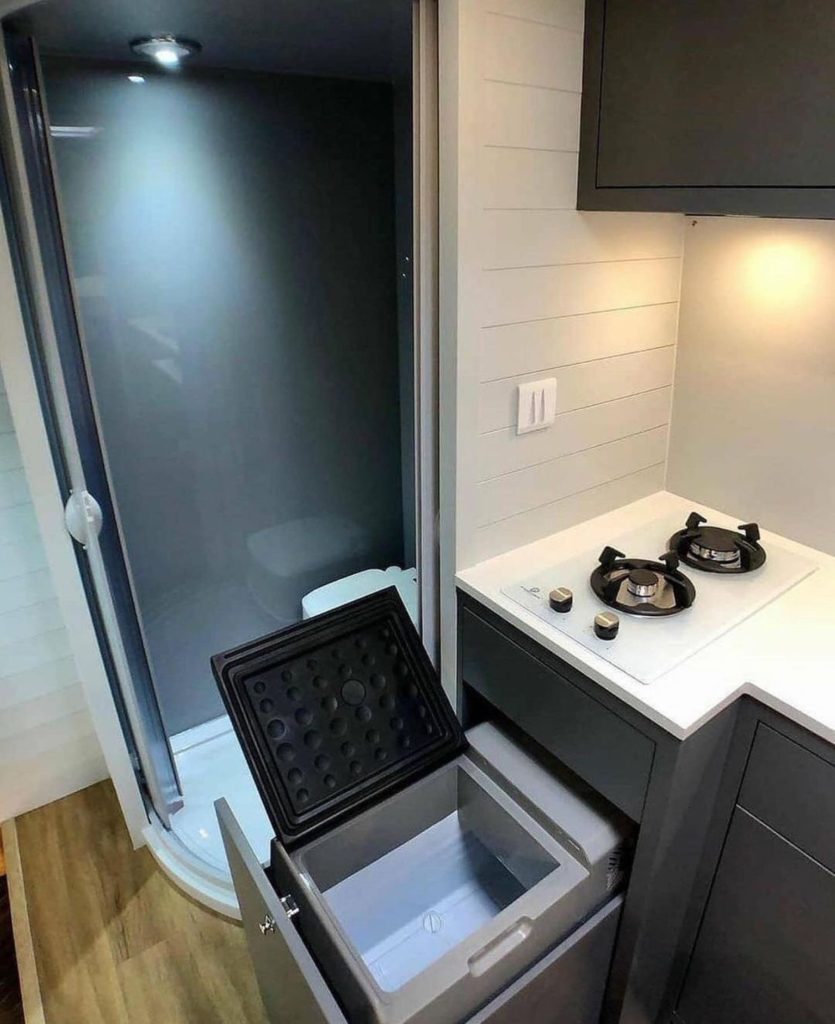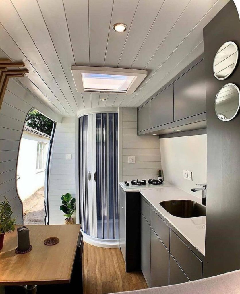 Al lado del baño, se encuentra una cocina súper funcional que cuenta con todo lo necesario. La mesada es de Silestone blanco y cuenta con griferías plateadas. Las alacenas se pintaron de color gris, otorgándole a esta casa rodante, ese toque moderno y elegante.
