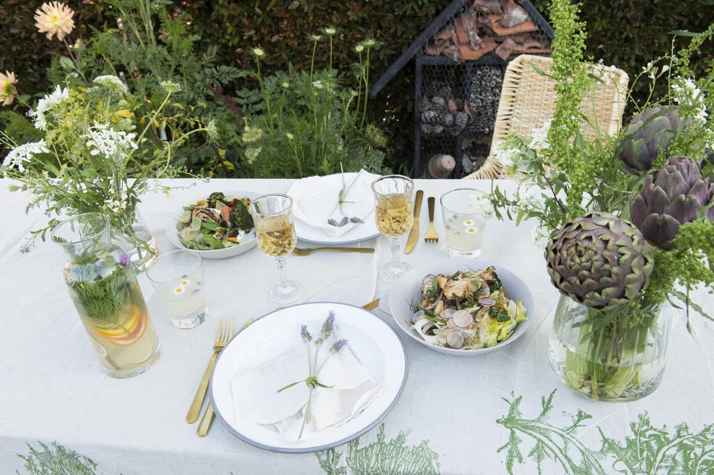 "Martín preparó tres opciones teniendo en cuenta lo que la tierra nos daba esta primavera. Y por mi parte, preparé la mesa. Seleccioné los platos enlosados. Afuera quedan divinos, elegí un mantel de lienzo que no fallan, y como siempre, decoré con un buen ramo de flores silvestres de mi jardín".