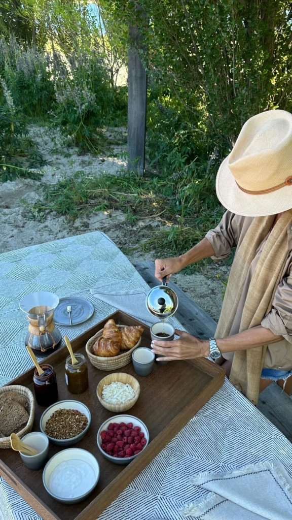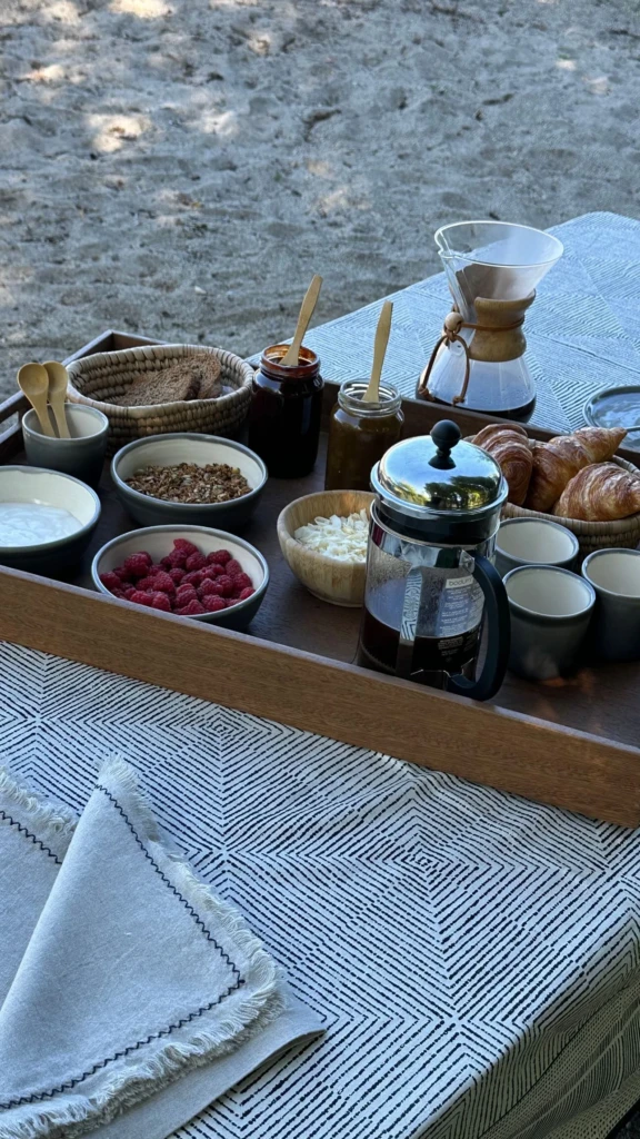 Para darle contraste, Juliana sumó una bandeja de madera oscura con todo lo necesario para un desayuno perfecto: croissants, frambuesas frescas, frascos con mermeladas artesanales, coco rallado y café, manteniendo esa esencia natural que tanto la define.