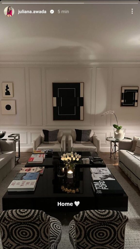 Como siempre, Juliana suma flores frescas que le dan vida al ambiente. También se ven pilas de revistas y libros apilados con onda, una bandeja de madera con mate y termo de cuero, organizadores de papelería y una mini lámpara de diseño minimalista.