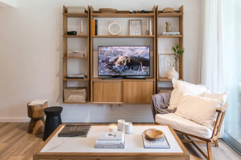 En el living, una biblioteca colgante de petiribí dialoga con un sillón Gervasoni con almohadones y manta tejida (@sinalmidon.ar), una mesa baja y un duo de taburetes en madera y quemado (@lazoestudio_ y @vir___maciel). En la biblioteca, cuadros intervenidos con tejido de hilo (@miliah__) y sobre la mesa, velas perfumadas (@apatheiadeco).