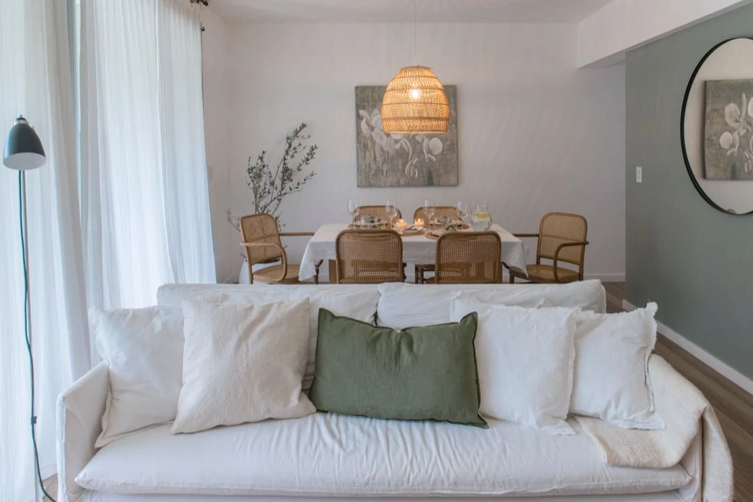 En la mesa, sobre unos individuales de palma (@beckhouse_), vajilla de cerámica (@elcaminostudio) y servilletas y servilleteros de yute (@apatheiadeco). Cuadro “Sutileza primavera” de la artista Norah Bas Caferatta (@arte.bas) en acrílicos sobre lienzo y, en esquina, árbol de olivo en maceta de fibrocemento blanca (@decoraconverde).