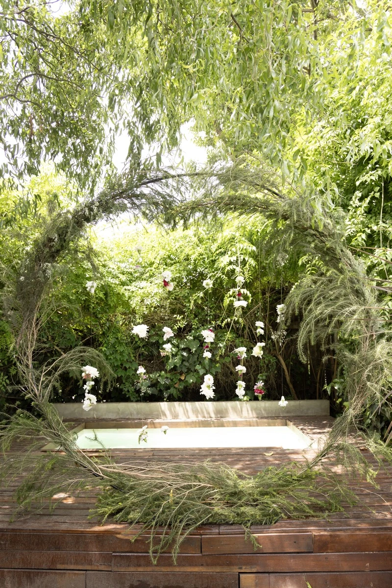 La madera “nos susurra” que somos parte de algo más importante, de la tierra, del tiempo. Y un aro de follaje natural y cortinas de flores enmarcan este espacio creado por @florencia.eventos_, mientras un cuenco de cerámica blanca con bordes orgánicos y un florero colorido (@casaclara_bsas) completan la atmósfera.