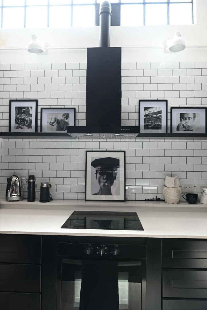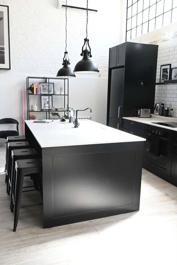 La modelo e influencer apostó a la combinación extrema black & white para diseñar y decorar una cocina con aires fabriles, minimalista, moderna y 100 % resuelta en blanco y negro.