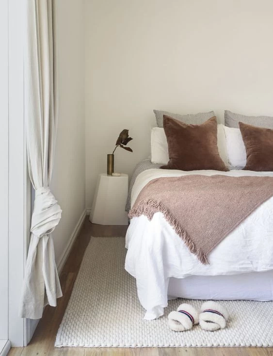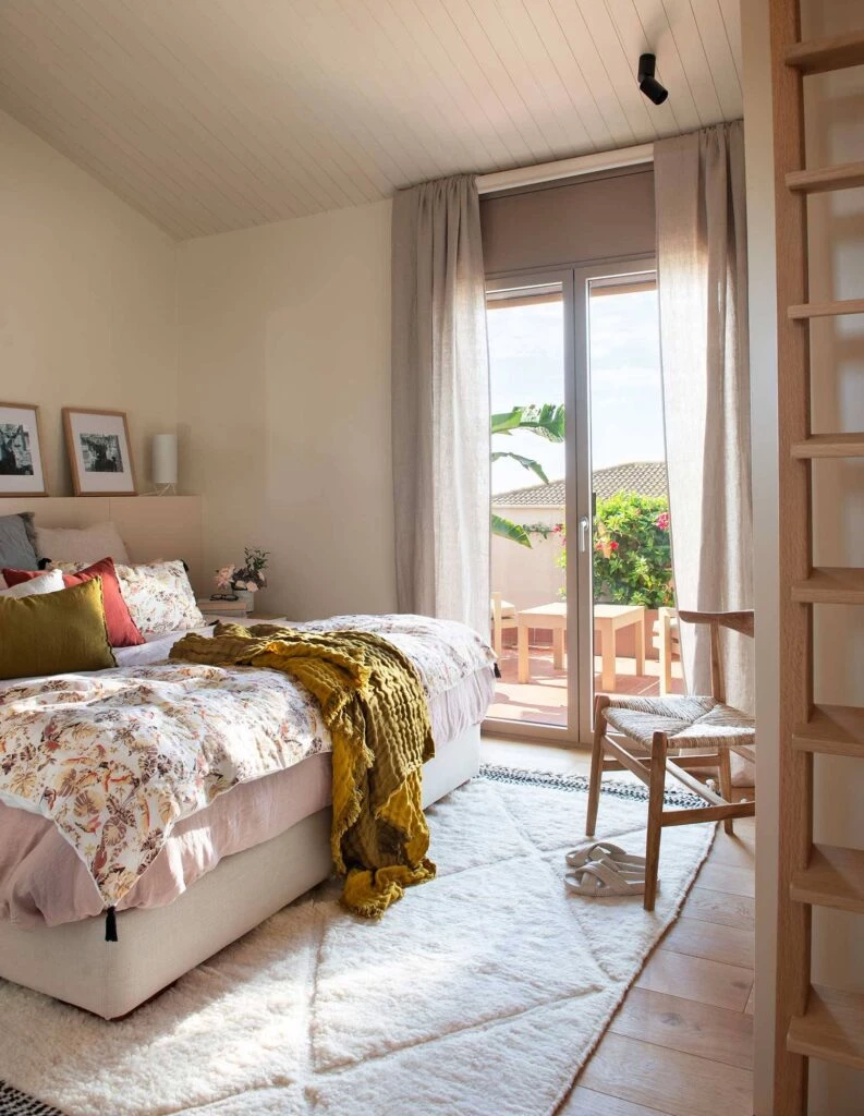 Ahora bien, en dormitorios pequeños, conviene poner una alfombra mediana al pie de la cama. De esta manera vas a conseguir calidez y una sensación súper acogedora sin sobrecargar demasiado el espacio.