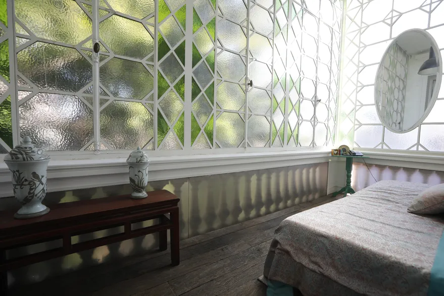 Al atravesar el portón, un caballo multicolor que antecede la puerta de ingreso a la casa llama la atención a primera vista. En cuanto a vegetación, hay palmeras, camelias en flor, álamos, un ginkgo biloba (el árbol que sobrevivió a la bomba de Hiroshima) y otras especies japonesas divinas.
