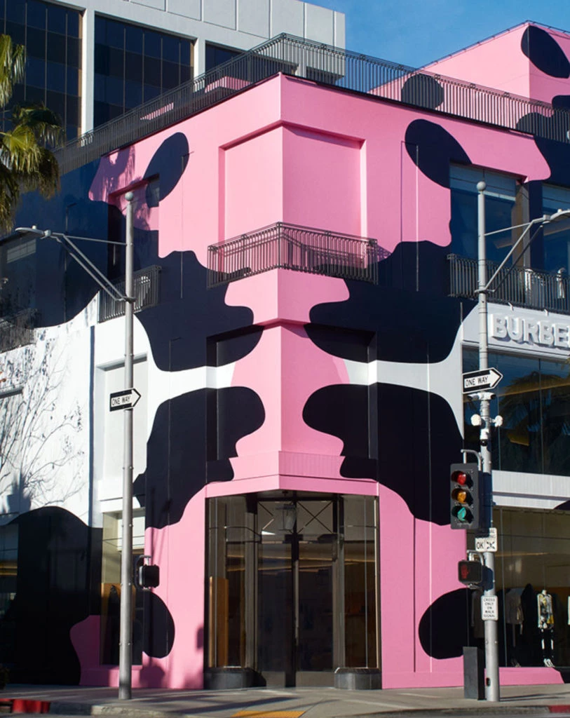 La fachada del edificio está envuelta en un estampado abstracto caleidoscópico, que evoca formas de camuflaje en rosa chicle, negro y blanco.