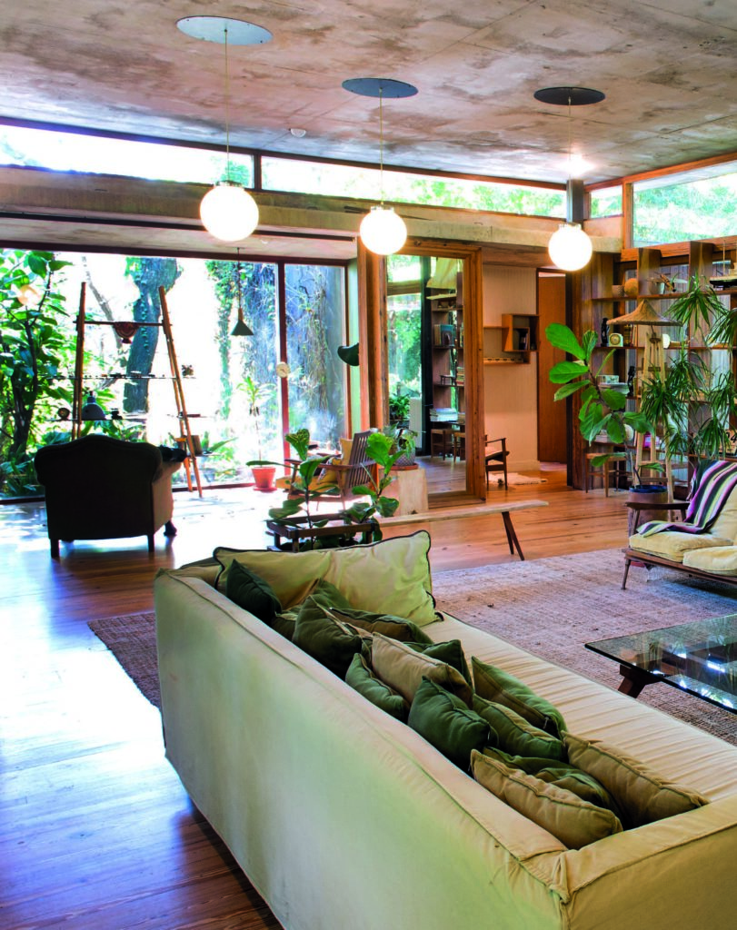 Aquí el piso (como en casi toda la casa) es de tirantes de pinotea que fueron rebanados para lograr el espesor indicado. “Fue la manera que encontramos de obtener tablones con ese ancho, como yo quería”, explica Mario. El espacio, totalmente vidriado, se abre por completo hacia la galería que actúa como comedor de exteriores y zona de parfotosrilla.