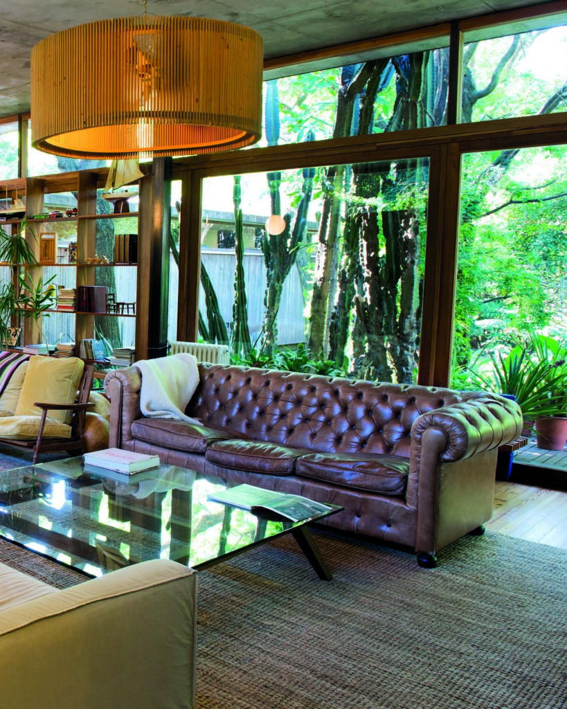 El living acomoda un sofá estilo Chesterfield hecho a pedido del dueño de casa por un tapicero, que se enfrenta a otro de tres cuerpos con funda teñida en color avellanada.