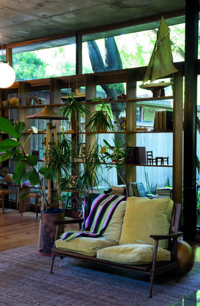 Un sillón escandinavo con almohadones de pana en color amarillo, un banco alargado y otro bajito tallados en madera, completan este sector resuelto en torno al tabique de laja San Juan que contiene la chimena, el leñero y la tevé. La gran biblioteca repleta de libros, revistas y objetos de diseño apoya sobre uno de los muros vidriados.