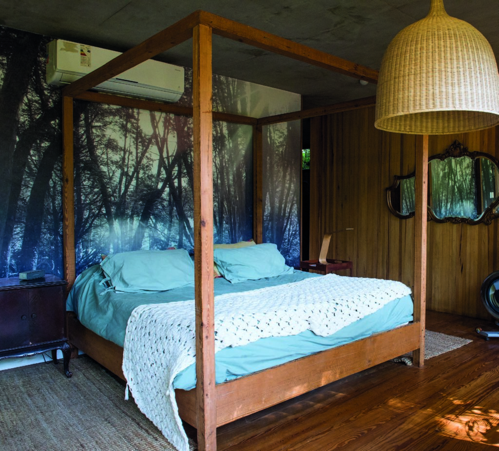 La casa tiene una disposición en forma de “T” con el módulo vidriado como centro neurálgico y un ala transversal para los dormitorios. Uno de esos lados lo ocupa por completo el dormitorio principal con su vestidor y baño. Este cuarto tiene dos paredes vidriadas que lo sumergen por completo en la naturaleza y una tercera -la cabera de la cama- en la que se introdujo la vegetación a través de un mural realizado con una foto de un bosque en Villa Pehuenia tomada durante unas vacaciones familiares.