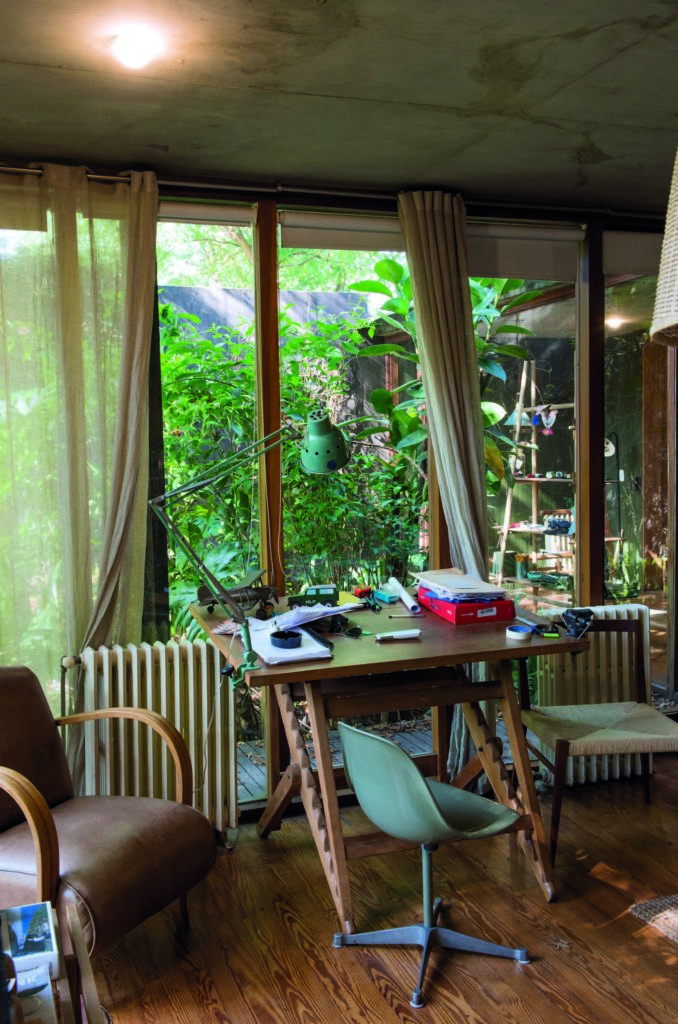 Un escritorio de cara al verde se suma al espacio, que se comunica en directo con un patio interno y privado donde Mario suele desayunar. La cama, como gran parte de los muebles, fue hecha por Mario, quien en sus momentos de inspiración se sienta en el tablero de dibujo que compró en una casa de antigüedades de Rosario para proyectar su próximo invento.