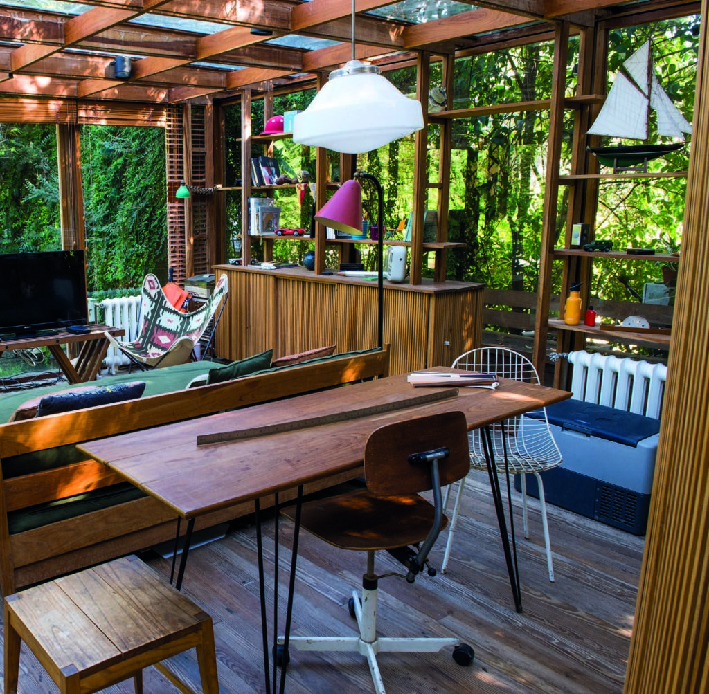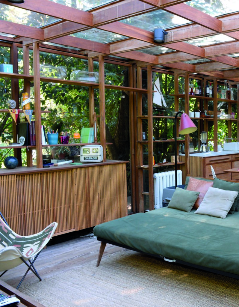 Esta caja de cristal y madera que Mario usa como su estudio, es uno de los últimos proyectos llevados adelante en su casa. Son 32 m2 y además de escritorio y área de relax tiene cocina completa, baño y ducha: un espacio ideal (y completo) donde aislarse.