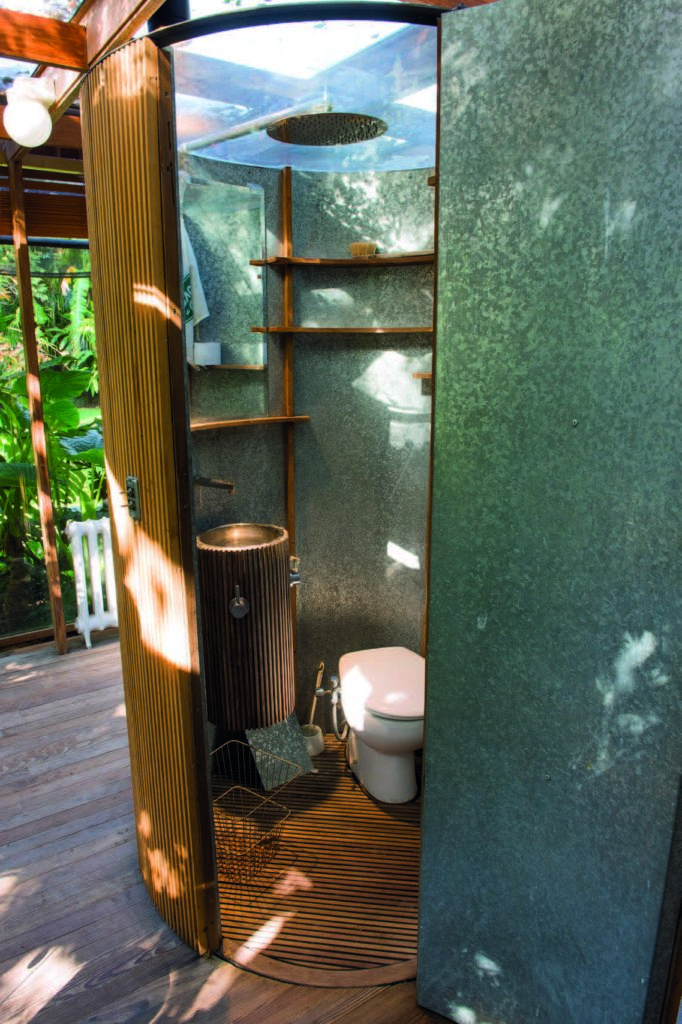 “Es como bañarse en el medio de la selva”, dice el dueño de casa, y festeja que unas ramas de hiedra se hayan colado en el interior del espacio. El vestidor de la suite principal contempla una zona de guardado con puertas de celosías antiguas recicladas, un viejo exhibidor de tienda y una cómoda de madera de estilo.